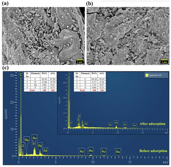 FESEM圖像對吸附前后活性炭的形態變化提供了詳細的視覺分析。吸附前圖像(圖1a)揭示了高度不規則和粗糙的表面形態,其特征是木質纖維素材料的多孔和片狀結構。大型裂紋,空隙和顆粒狀碎屑很普遍,所有這些都導致了高表面粗糙度,并增強了可用的表面積以吸附。此外,發達的孔隙的存在證實了正磷酸激活在建立層次多孔網絡中的有效性,非常適合染料擴散。活性炭表面在吸附后經歷了顯著的形態轉化(圖1b)。最初粗糙和不規則的質地變得更加順暢,表明剛果紅分子的成功粘附。裂紋,空隙和孔隙開口的可見性降低,進一步支持了這種轉變。進行EDS以分析活性炭的元素性質(圖1C)。吸附之前,活性炭表現出C和O的主要峰,這確定了活性炭的形成。另外,在正磷酸激活期間引入的磷最初以痕量量存在。