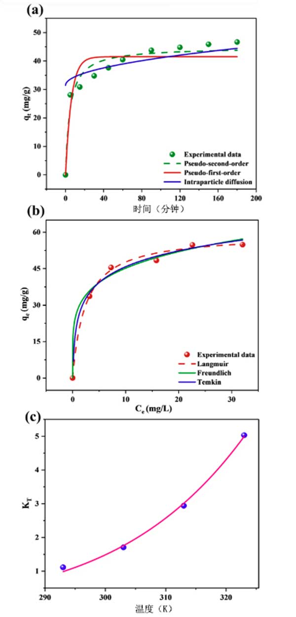 圖3:(a)吸附動力學,(b)吸附等溫線和(c)van't hoff圖,用于吸附Cr上的活性炭上。