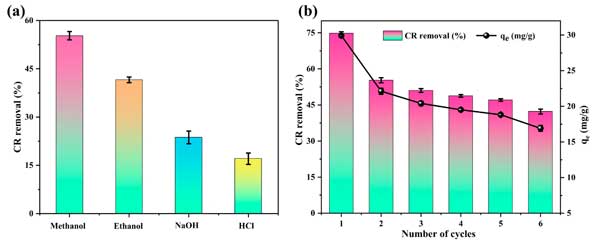 圖4:(a)使用不同的解吸劑后,cr的活性炭的吸附效率;(b)甲醇在六個連續吸附-吸附周期內通過甲醇的吸附效率。