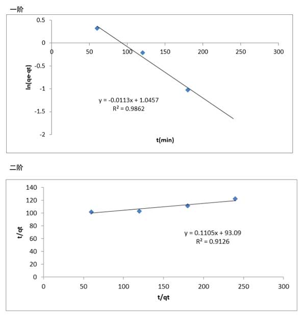 圖3:活性炭吸附柴油脫硫的一階動力學和二階動力學。