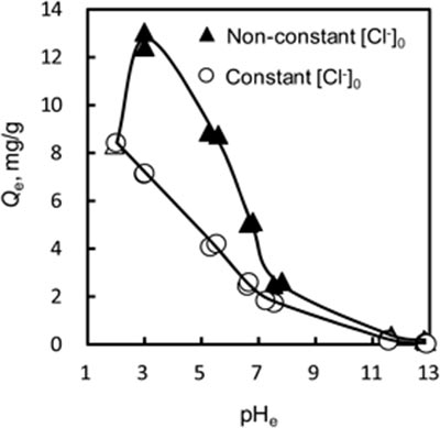 活性炭上的硝酸根離子吸附量與溶液的pH e之間的關系如圖1所示。硝酸根離子在堿性條件下幾乎不被吸附,這意味著氫氧根離子會抑制硝酸根離子的吸附。另一方面,隨著平衡pH的降低,硝酸根離子的吸附量增加。在堿性條件下,由于硝酸根離子與活性炭表面之間的靜電排斥,硝酸根離子很難被吸附在活性炭上。另一方面,硝酸根離子的吸附量在酸性條件下增加,這歸因于硝酸根離子與碳表面之間的靜電吸引力。然而,隨著平衡pH從3.0降低到2.0,觀察到硝酸根離子吸附的顯著降低。在此pH范圍內(nèi),氯離子的初始濃度從2 m增加到20 m M,這意味著共存的氯離子會抑制硝酸根離子的吸附。通過NaCl溶液將氯離子的初始濃度固定在20 m M時,可以清楚地發(fā)現(xiàn)氯離子對硝酸根離子的吸附抑制作用,表明硝酸根離子在所有pH區(qū)域的吸附量均低于沒有任何pH調(diào)節(jié)的溶液。因此共存陰離子會導致競爭吸附影響硝酸根離子吸附的效果,并且這種作用可能是較強的在共存陰離子的濃度較高。