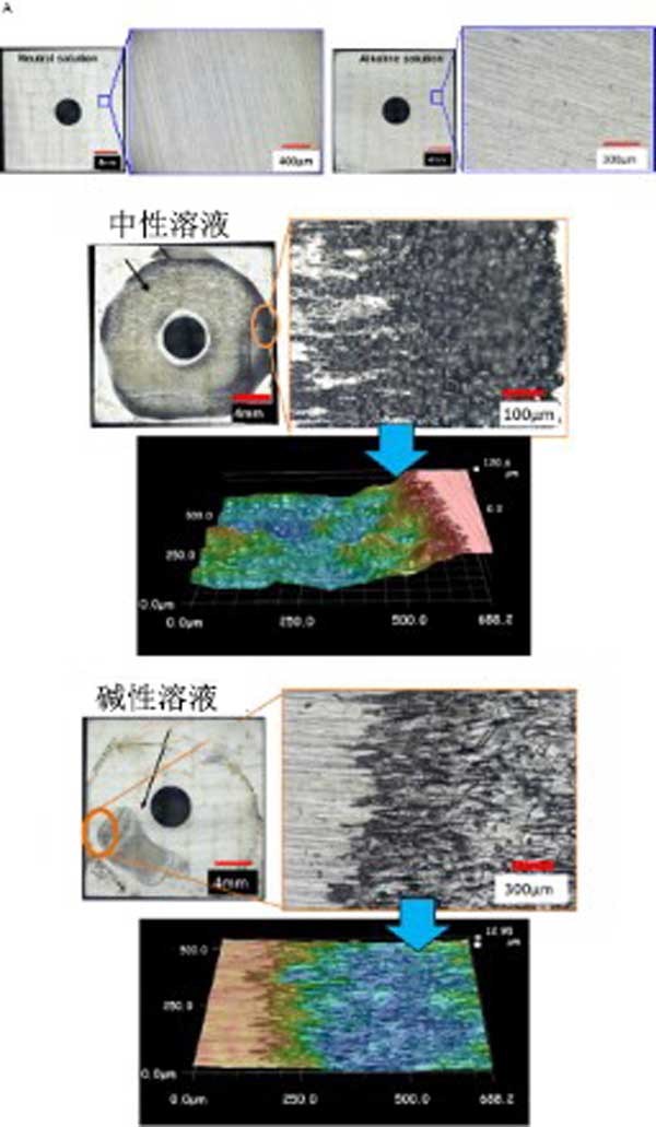 使用光學顯微鏡觀察實驗后樣品的表面形態,如圖3所示。在中性和堿性溶液中未與活性炭接觸的樣品中未觀察到縫隙腐蝕。另一方面,在中性和堿性測試溶液中與活性炭接觸的樣品上發生縫隙腐蝕。這些結果清楚地表明,當樣品與活性炭接觸時,縫隙腐蝕敏感性增加。在中性測試溶液的情況下,最大腐蝕深度為130μm并且縫隙腐蝕傳播以覆蓋樣品的幾乎所有褶皺區域。在堿性測試溶液的情況下,最大腐蝕深度為25μm并且腐蝕區域遠小于中性溶液的情況。這些結果表明,在中性溶液的情況下腐蝕區域和深度更大,這表明在吸附塔中發生實際腐蝕。在堿性溶液的情況下腐蝕面積和深度較小的原因被認為是Fe(OH)2的溶解速率的事實堿性溶液減少,這導致腐蝕速率降低;旧希陉枠O部位的pH降低至去鈍化pH是縫隙腐蝕開始和傳播所必需的。考慮到這個方面,還可以解釋縫隙腐蝕行為的差異。